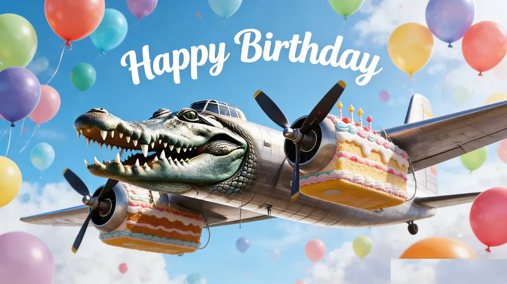 The Bombardino Crocodilo, with its metallic mechanical flair, soars through the sky. Two propellers encircle a birthday cake, wishing you a happy birthday.